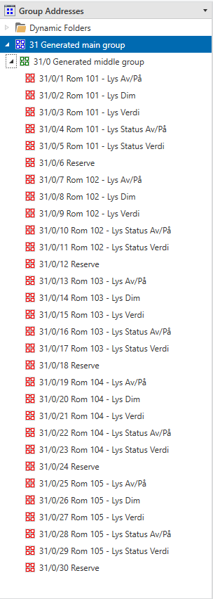 Vis generert ETSVanligvis bruker jeg ETS - Extended Copy for å kopiere all funksjonalitet for et rom (inkludert gruppeadressene), men når jeg må ha gruppeadresser som avviker med den brukte strukturen i prosjektet vil ikke funksjonaliteten i Extended Copy holde. Det må derfor genereres manuelt og linkes i etterkant. Da benytter jeg dette scriptet for å generere de for meg, basert på innfylt skjema.